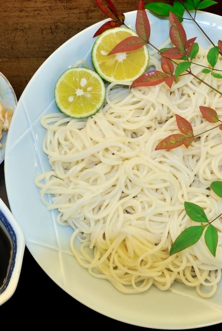 소면은 보통 무척 가늘지만, 도쿠시마 버전인 한다 소멘은 꽤 굵습니다. 밀가루와 소금물로 반죽해 숙성하고 늘린 다음, 젓가락으로 일일이 떼어냅니다. 매끈하면서 약간 짭짤한 맛이 나는 소면을 깔끔한 간장을 기본 양념으로 한 국물에 담가 차게 먹는 것이 일반적입니다.